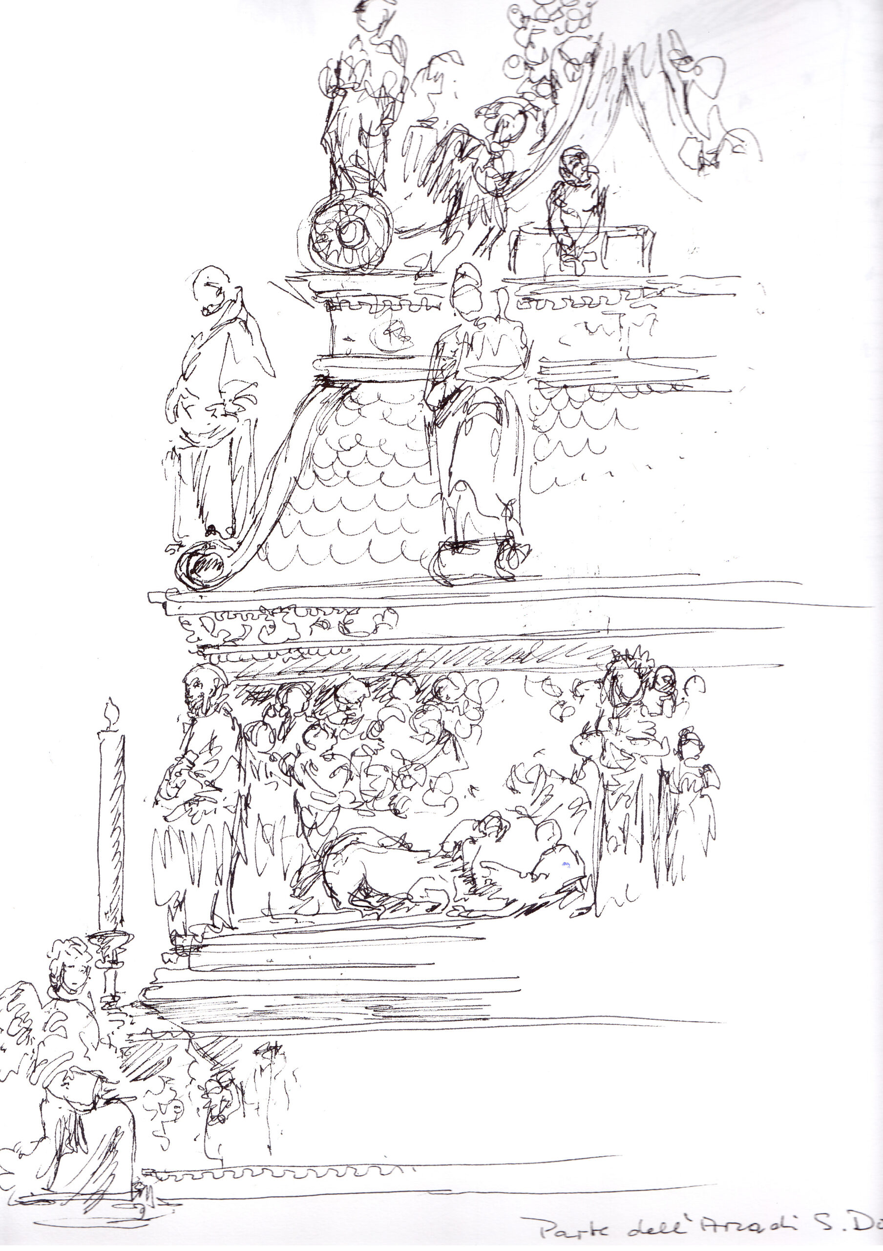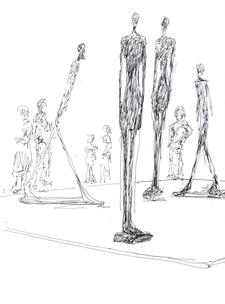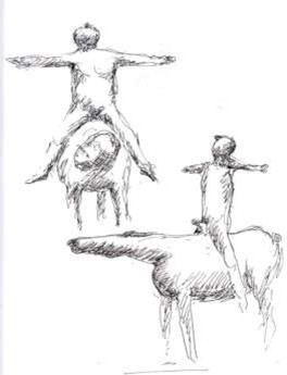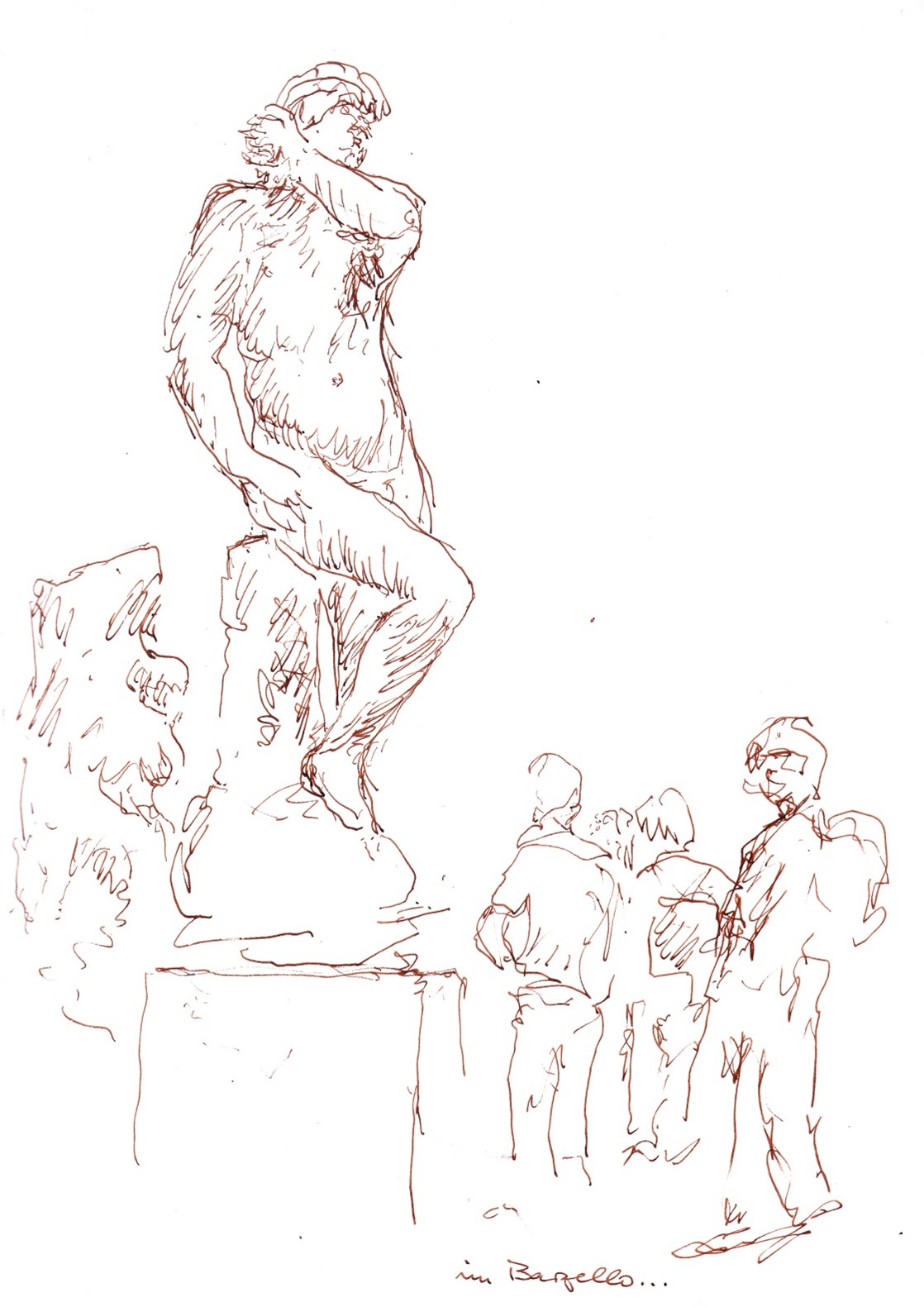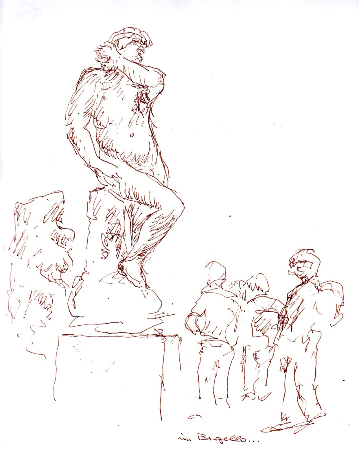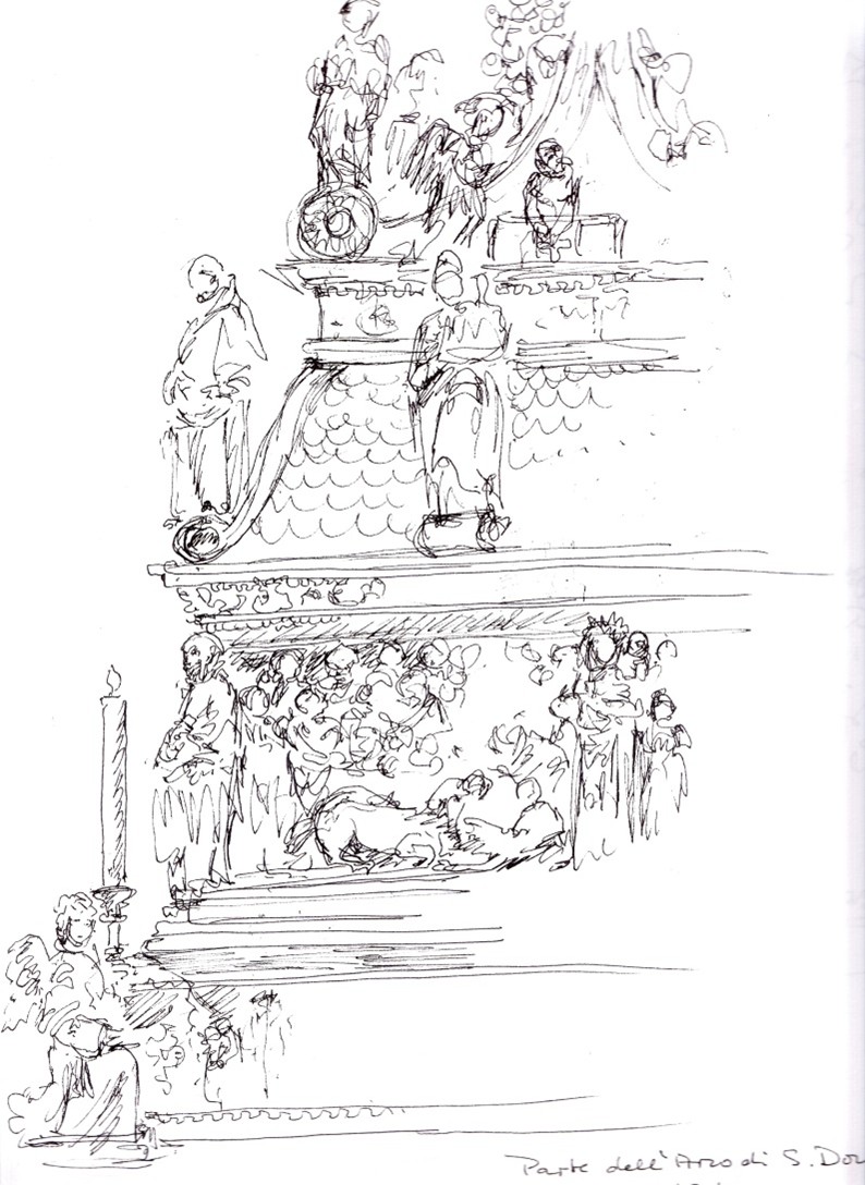 Auf den ersten Blick mag man sich fragen, welche Beziehung die einzelnen Figuren zueinander eingehen. Es gibt zwar zwei Gruppen, aber auch zwei einzeln stehende Personen, ein Gesamtzusammenhang lässt sich so zunächst nicht herstellen.