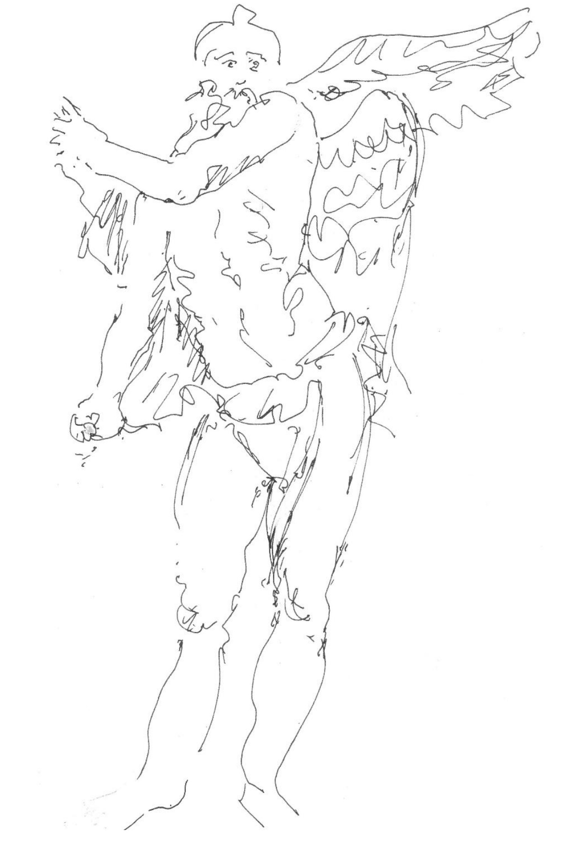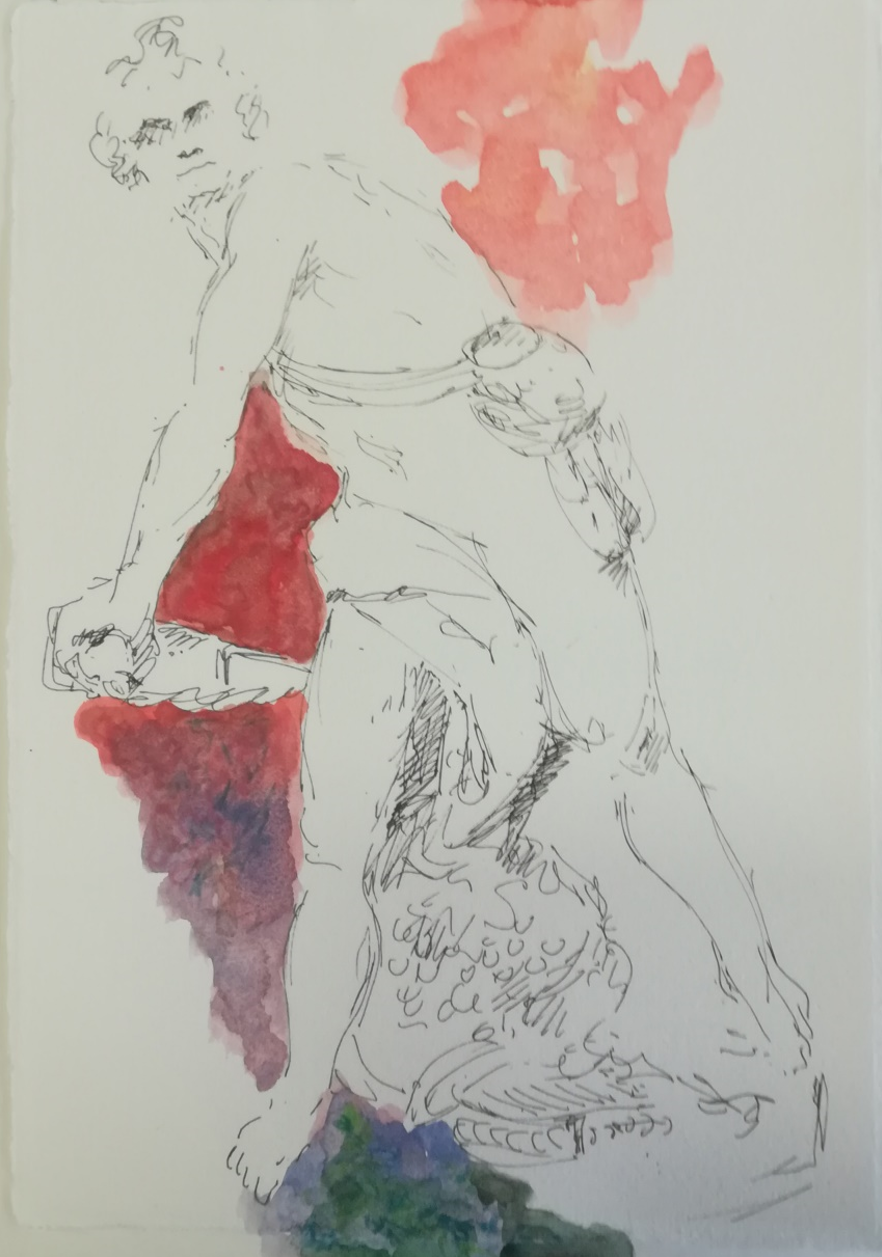Links von ihnen steht ein junger Mann im Kontrapost, der zwar nur ein rotes Tuch locker umgehängt hat, dafür aber an seiner linken Hüfte ein Schwert trägt. Den linken Arm hat er lässig in die Hüfte gestemmt, der rechte Arm ist hoch erhoben – in seiner Hand hält er einen ‚magischen’ Stab, der im oberen Bereich von zwei Schlangen umkreist wird. Schaut man ganz genau hin, dann sieht man, dass er dabei ist, Wolken von dem Geschehen auf dem Bild abzuwehren. Da er auch Schuhe mit Flügeln trägt, kann er eindeutig als Merkur identifiziert werden, ebenso wie die schon genannten Grazien und Amor gehört er zum Gefolge der Venus.
