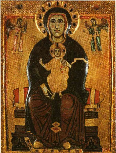 Am besten liest man das Bild von der Mitte aus. Dort steht eine alle anderen Personen des Bildes überragende Frau. Sie trägt ein kostbares Gewand aus einem silbrig grauen, fließenden Kleid, das deutlich ihre Körperformen durchscheinen lässt. Zusätzlich zu dem Kleid hat sie über ihrer rechten Schulter und dem rechten Arm ein rotes Tuch, das sie mit der linken Hand so vor den Körper hält, dass der schwellende Bauch gut zu sehen ist. Der Kopf ist leicht zu Seite geneigt, sie hat ihren rechten Arm erhoben und macht dabei mit der Hand eine graziöse Bewegung, vielleicht so, als ob sie das Geschehen auf dem Bild dirigierte. Es handelt sich dabei um Venus – sie ist aber auf eine Art und Weise dargestellt, dass man bei ihr auch an Maria denken könnte.