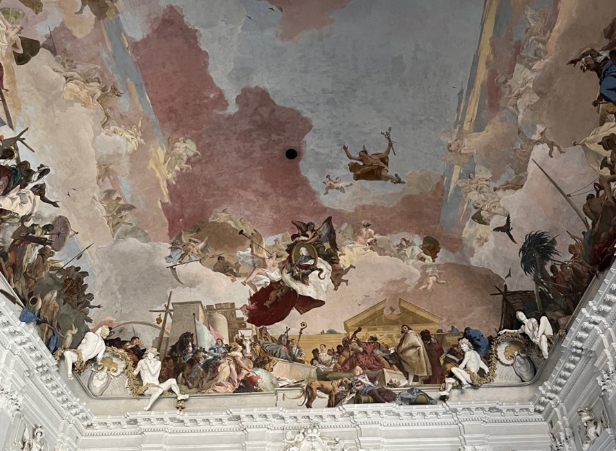 Bei diesem ersten Kunsträtsel handelt es sich um ein recht großes Bild – es misst immerhin 203 X 314 cm. Dargestellt sind vor einer dunklen Baumkulisse insgesamt zwei Männer und sechs Frauen, dazu kommt noch ein kleiner Putto.